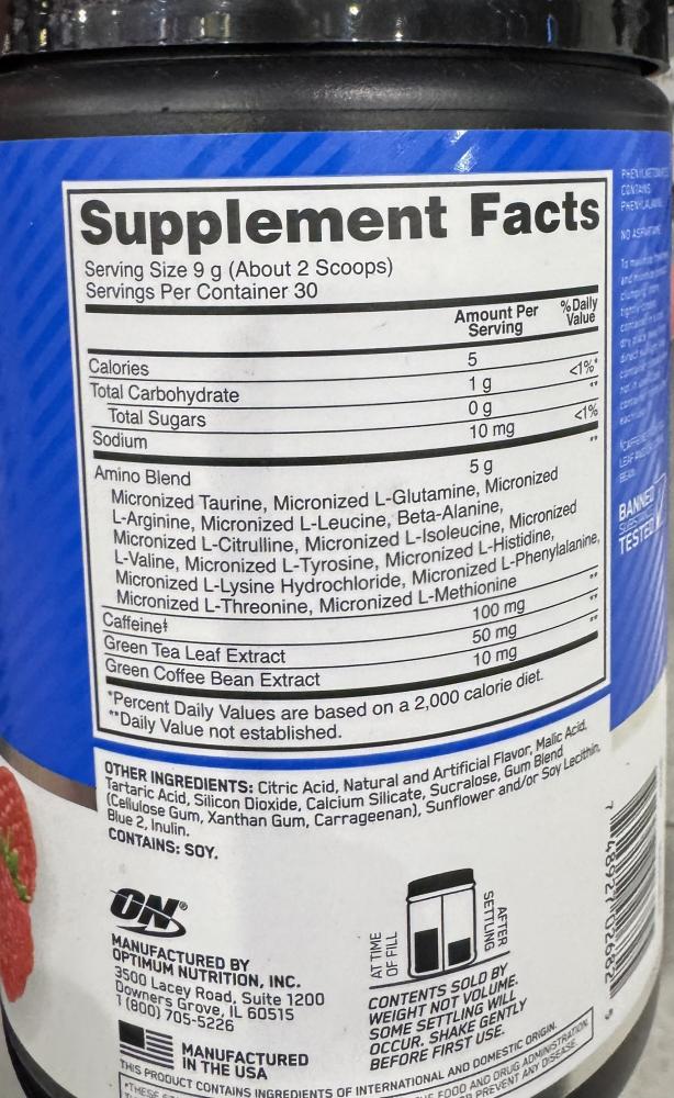 - امينو انيرجي يحتوي على 100 ملغ من الكافيين ما يساعد على تعزيز الطاقة والتركيز أثناء التمارين.